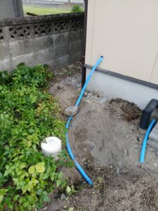 中央市N様邸 水道増設工事2箇所、重機使用、穴あけ1箇所Φ32 工事前・工事中 工事後 中央市N様邸 水道増設工事2箇所、重機使用、穴あけ1箇所Φ32 工期1日 金額370.000税込